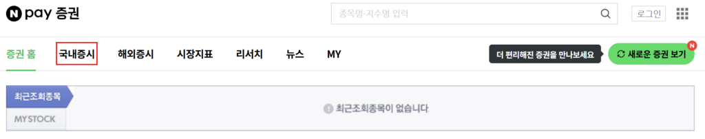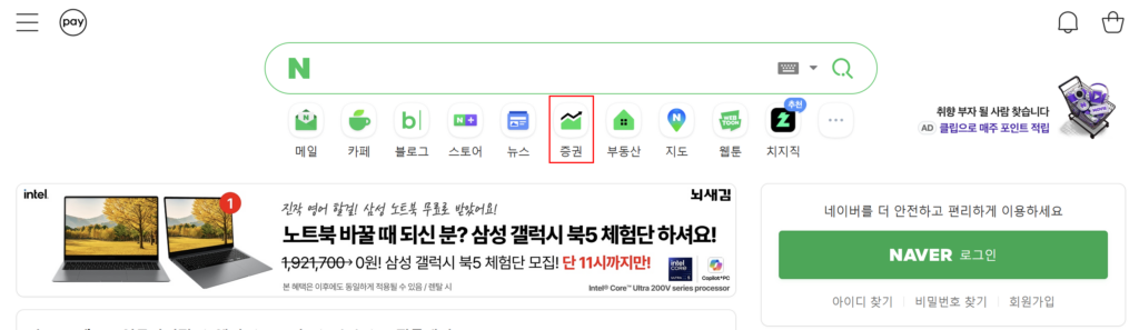 네이버 증권은 네이버 메인화면에서 ‘증권’을 누르면 접속할 수 있다.