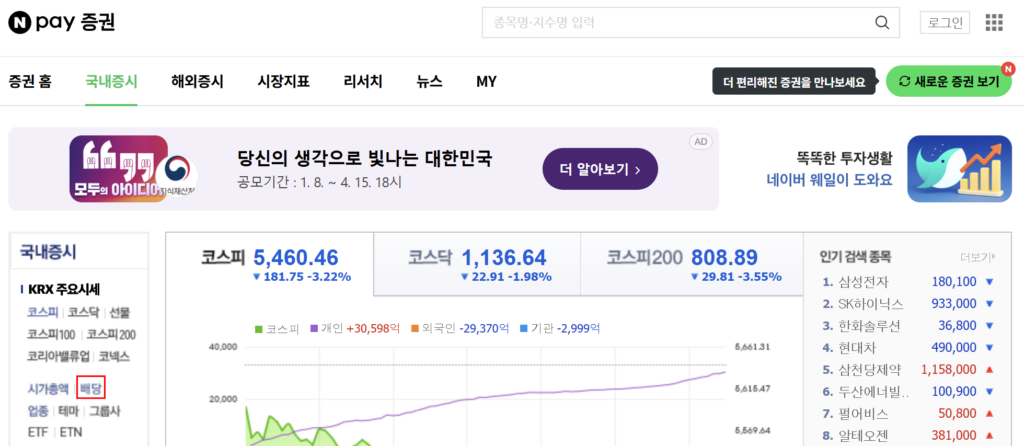 네이버증권(Npay 증권)에서 국내 상장 기업 배당정보 확인하는 방법