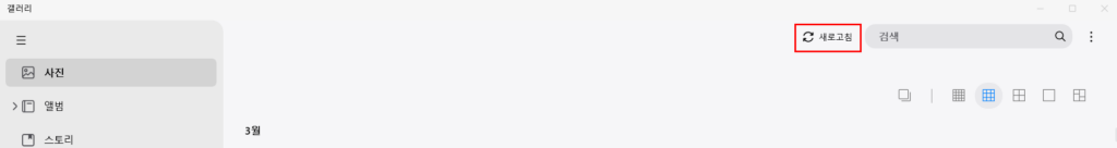 그다음 뒤로 가서 갤리리앱의 ‘새로고침’을 눌러주면, 갤럭시 스마트폰에 있는 사진들이 드디어 갤럭시북에서도 확인할 수 있게 된다.