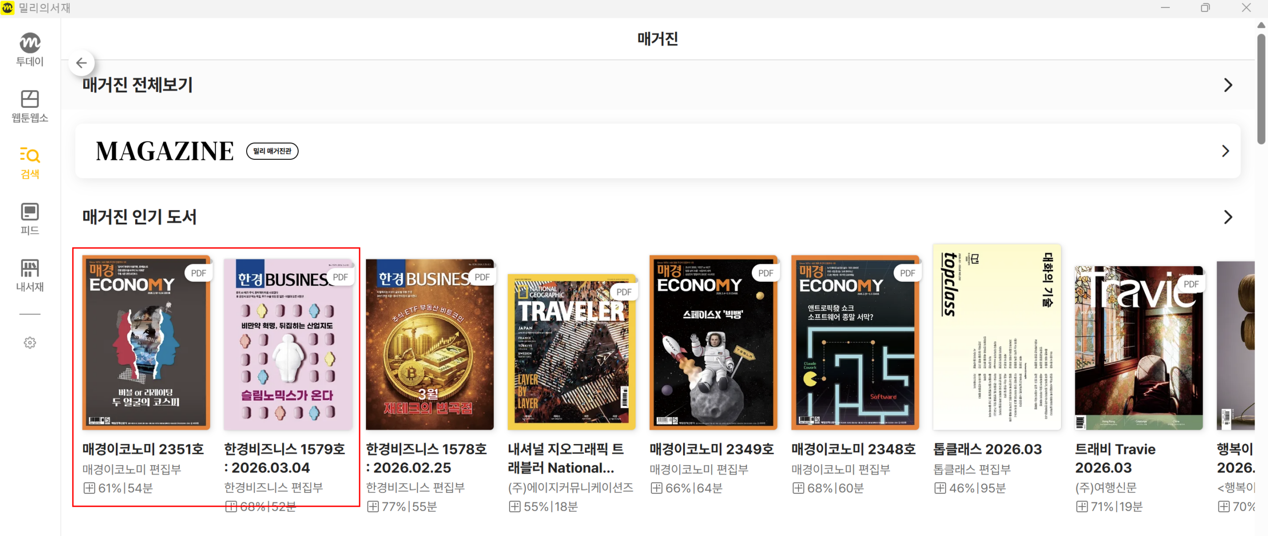 경제 주간지를 읽어보기 위해서는 구독료를 내야 하는데, 내가 추천하는 방법은 ‘밀리의 서재’ 앱을 활용해서 [매경이코노미]나 [한경비즈니스] 같은 경제 주간지 읽기다. 밀리의 서재 월구독료를 내면 경제 주간지뿐만 아니라 다른 책들도 읽어볼 수 있으니 일석이조다.