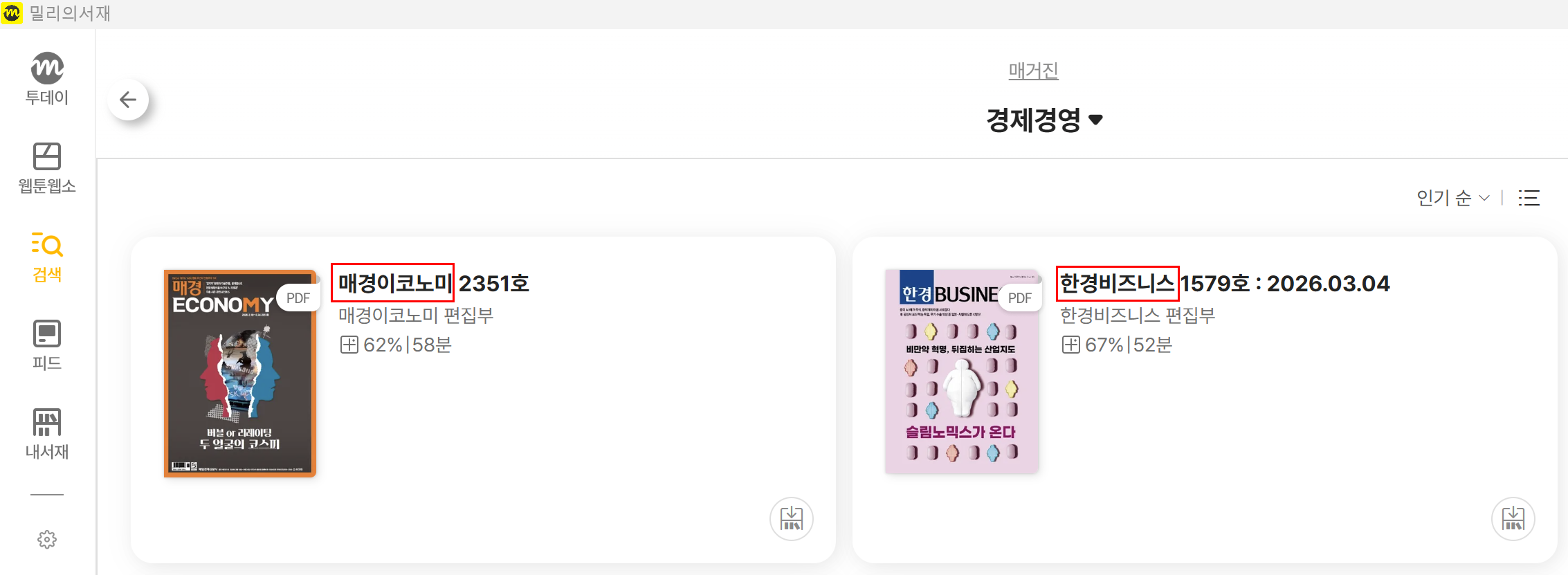 저처럼 경제흐름을 놓치고 싶지 않은 분들에게 밀리의 서재를 이용해 한경비즈니스와 매경이코노미 구독을 권해본다.
