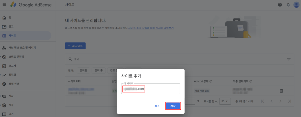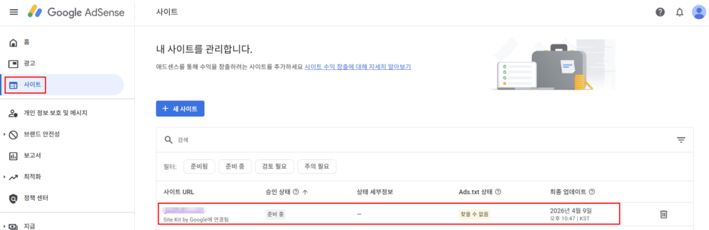 이제 구글 애드센스에서 ‘사이트’를 누르면 방금 추가한 내 워드프레스 사이트를 확인할 수 있다.