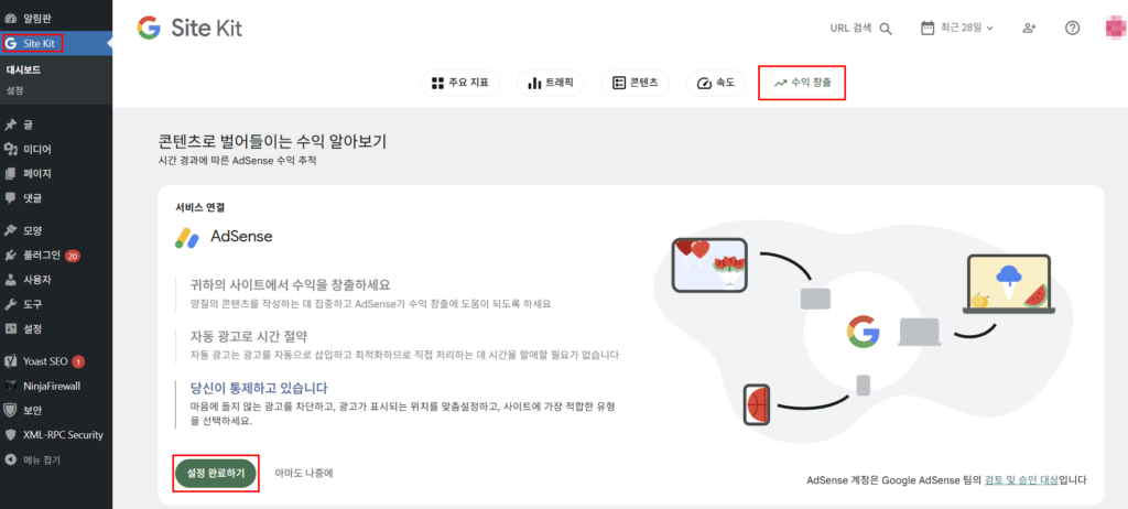 이제 다시 워드프레스 관리자 화면에서 ‘Site Kit’ – ‘수익 창출’을 선택하고, ‘설정 완료하기’를 누르면 된다.