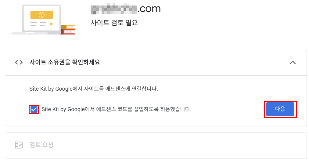 ‘Site Kit by Google에서 애드센스 코드를 삽입하도록 허용했습니다’를 체크하고, ‘다음’을 누른다.
