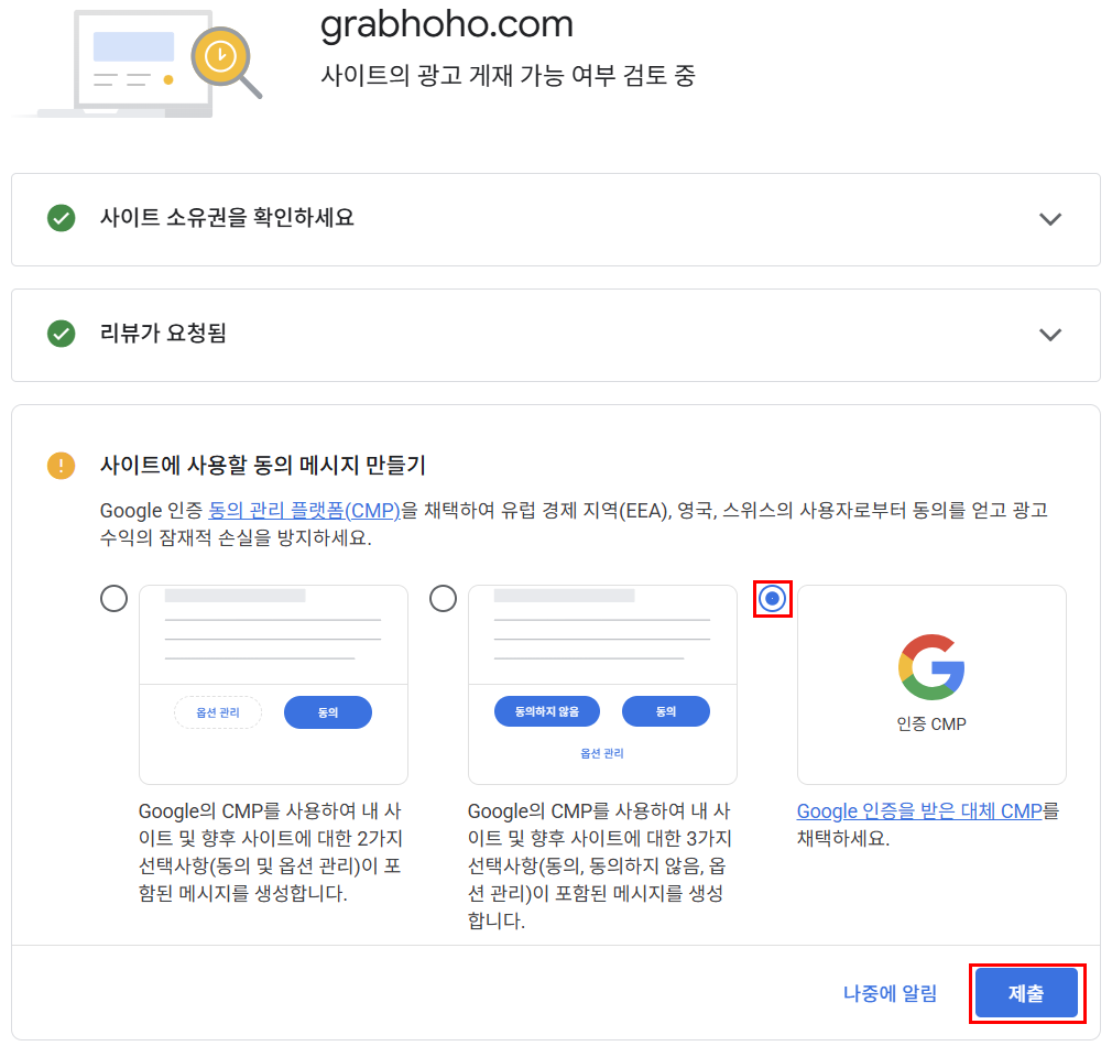 ‘사이트에 사용할 동의 메시지 만들기’에서 ‘Google 인증을 받은 대체 CMP를 채택하세요’를 선택한 뒤, ‘제출’을 누른다.