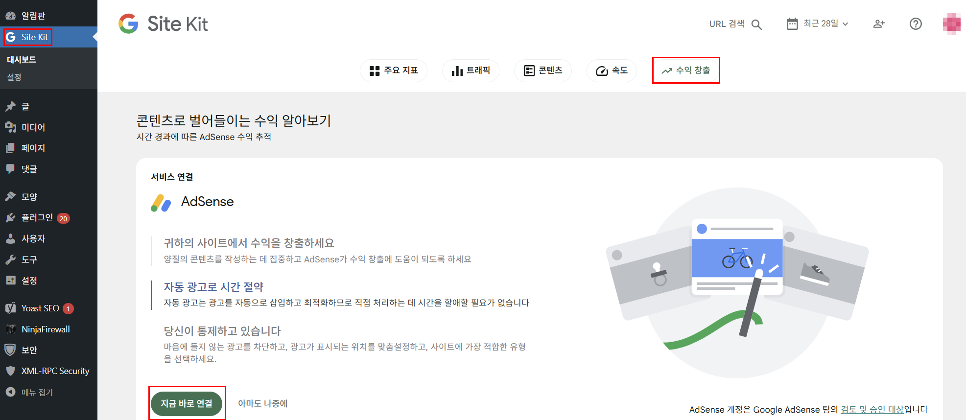 워드프레스 관리자 화면에서 ‘Site Kit’ – ‘수익창출’ – ‘지금 바로 연결’을 누른다.